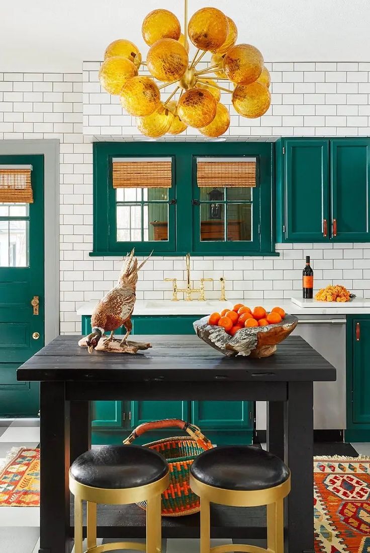 Complete with greenish blue cupboards and energetic floor coverings, this mixed kitchen is brimming with variety and energy. Creator Precious stone Blackshaw takes it further with a golden sputnik globe ceiling fixture that fills in as the room's point of convergence.
