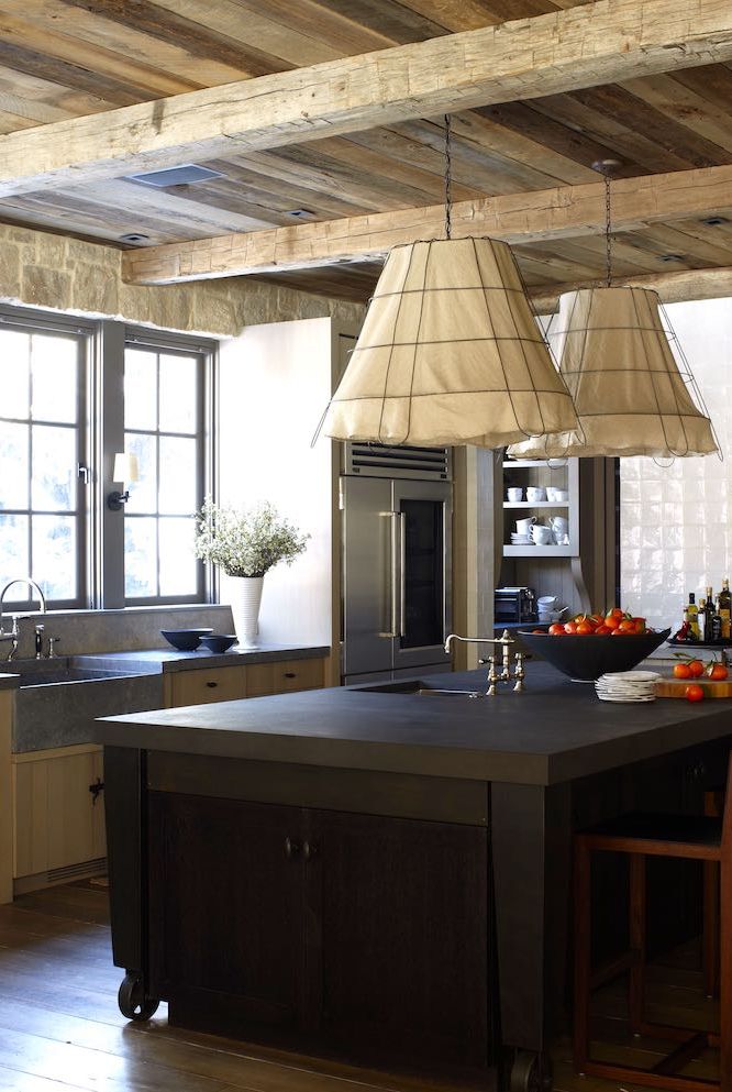 Here, M. Elle Design blends rustic design (most notably the raw wood beam ceilings) with modern features. The large conical drum pendants make a statement and tie the entire space together.
