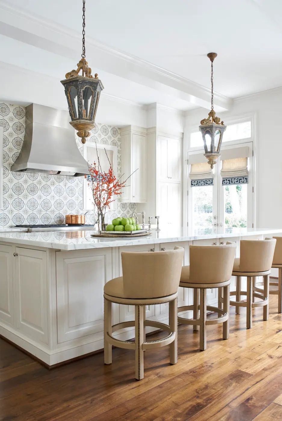 Give your space a farmhouse feel with a pair of distressed pendants, whether you found the fixtures at a local antique shop or bought vintage-style pendants from your favorite retailer. Vintage lanterns aside, Dodson Interiors keeps the rest of this space very modern.